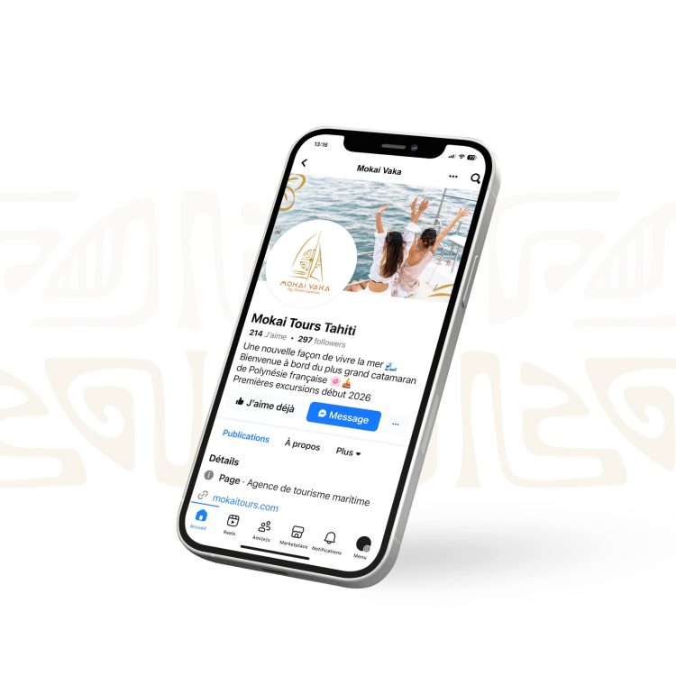 Inspirée de la pirogue double des navigateurs polynésiens, cette identité puise dans les racines culturelles et l’art de vivre océanien pour refléter la vision de Mokai : un tourisme respectueux, authentique et profondément enraciné dans le Fenua.